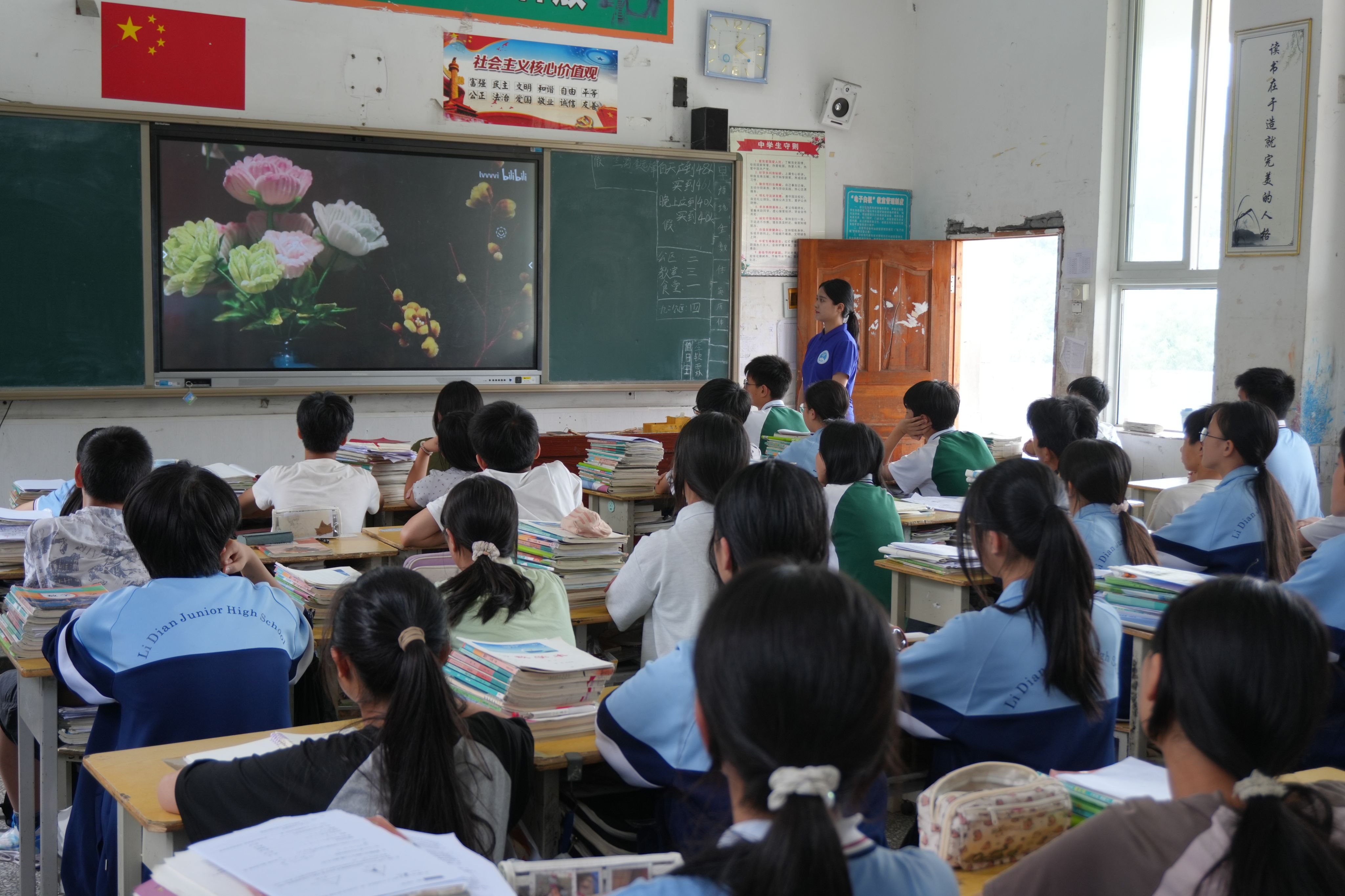 首先支部书记王娜介绍了主题党日活动开展的背景、意义以及支部系列党日活动的开展情况。接着,支部党员周哲鹏以线上形式主讲了文化自信专题党课,学习了习近平文化思想的核心要义,结合非物质文化遗产保护背景,以南京绒花为生动案例,详细剖析其历史脉络、精湛工艺与独特审美价值,并着重阐释了当代青年在文化传承与创新中肩负的使命担当。线上党课结束后,支部支教党员王梦婷组织现场交流讨论,引导员工将党课所学与日常学习、社会实践相结合。利店中学同学们踊跃发言,纷纷表示要自觉成为中华优秀传统文化的传承者与弘扬者。支部党员也表示将持续深化文化自信,将理论与实践结合,强化党团共建,健全长效联动机制,通过定期组织研讨交流、社会实践和志愿服务,构建紧密的“党支部—团支部”联动格局。