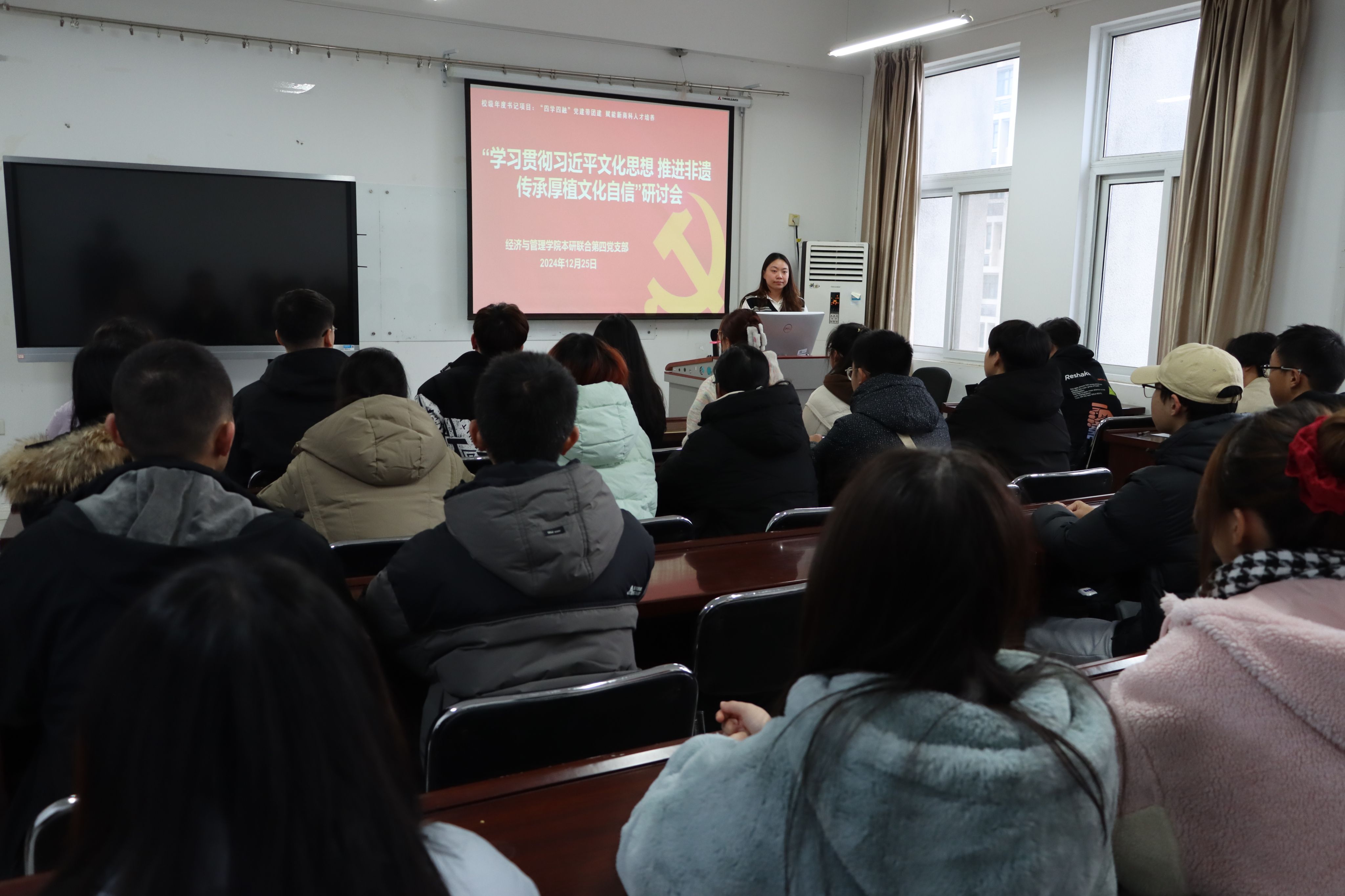 12月25日下午,太阳成集团122ccvip本研联合第四党支部在博学楼622举行“学习贯彻习近平文化思想 推进非遗传承厚植文化自信”主题研讨会。本次研讨会是“文化自信薪火相传,党团共建砥砺前行”系列活动之一。支部全体党员以及2024级会计学、信息管理与信息系统、市场营销学专业团员代表30余名参加。研讨会由党支部副书记应源圆主持。