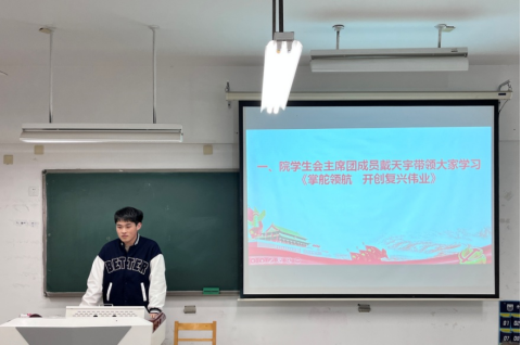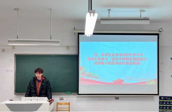 文体部部长张令宇带领大家学习《坚定不移朝着强国建设、民族复兴的宏伟目标奋勇前进》,强调我们要增强历史主动、发扬斗争精神,打开事业发展新天地,牢记高质量发展是全面建设社会主义现代化国家的首要任务。