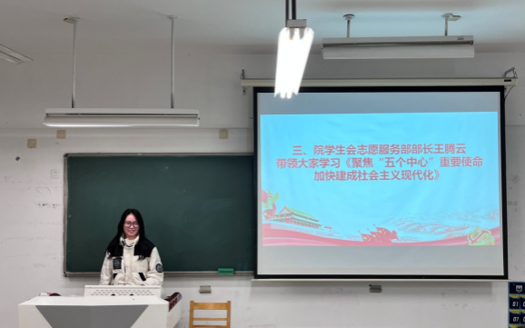 志愿服务部部长王腾云带领大家学习《聚焦“五个中心”重要使命,加快建成社会主义现代化》,强调要贯彻新时代中国特色社会主义文化思想,深化文化体制改革,激发文化创新创造活力,大力提升文化软实力。