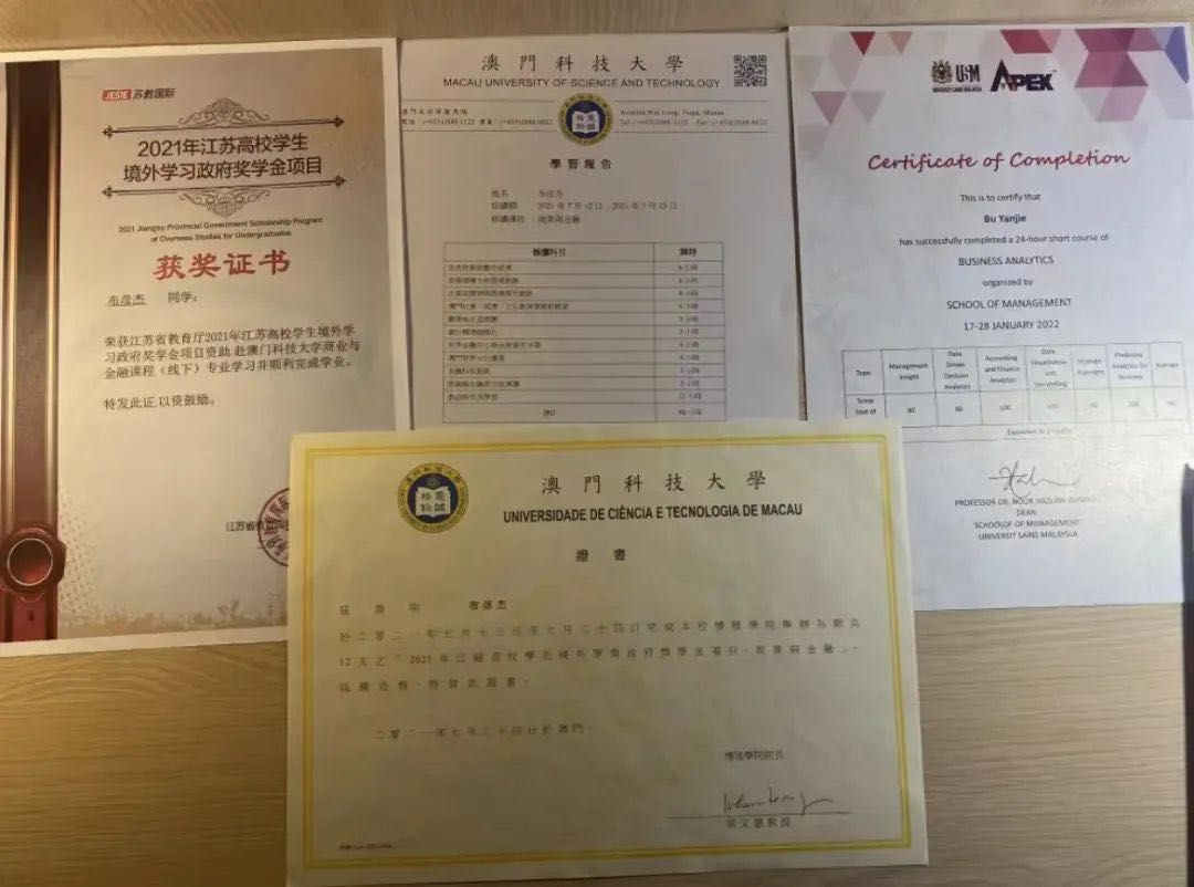 在校期间,布彦杰同学立志通过竞赛实践丰富专业知识,提升专业素养。布彦杰同学曾先后斩获“正大杯”全国市场调查与分析大赛省级一等奖、“学创杯”全国老员工创业综合模拟竞赛省级二等奖、“知链杯”江苏省老员工金融科技应用技能竞赛本科组决赛二等奖等荣誉。布彦杰同学在参加江苏省境外留学奖学金项目期间,访学了澳门科技大学,学习了商业与金融课程,这是他本科阶段最难忘的求学经历。在这次访学中,布彦杰同学真正看到了不一样的金融学,看到了有关大数据、计量经济学的一面,学到了数据分析的技术,对商业分析专业也产生了浓厚的兴趣。在此之后,布彦杰同学又积极参加了马来西亚理科大学商业分析课程,学习了许多数据可视化的内容。在开阔眼界的同时,商业分析这一课题也在布彦杰同学心中埋下种子。
