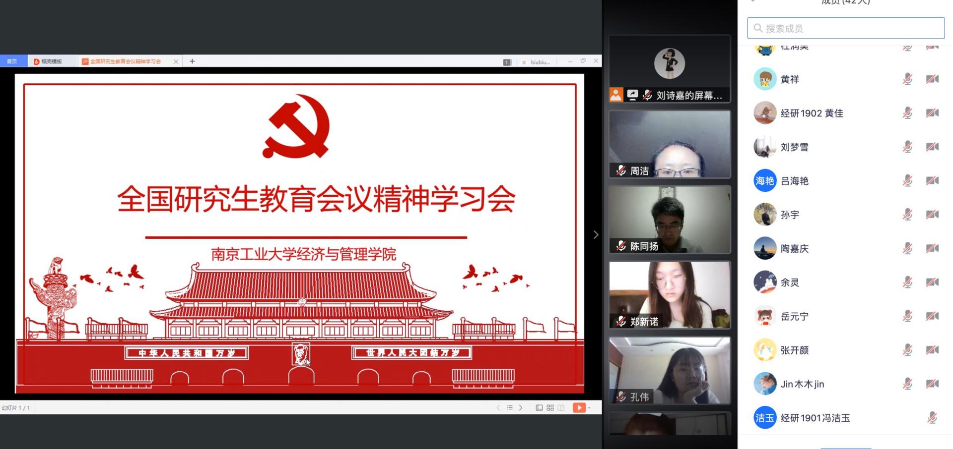 会上,研究生代表同学分别作重点发言,研究生第五党支部书记杜润昊同学领学了本次全国研究生教育会议中习近平总书记做出的重要指示内容;黄佳和尚明杰两位同学分享了此次全国研究生教育会议学习心得;院研会副主席蒋莎莎同学向同学们介绍了新中国成立以来研究生的发展历程。