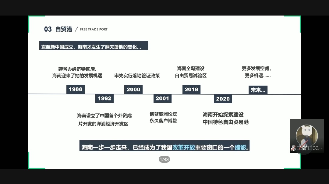 首先,张老师用生活常见的例子引出了保税区和自贸区的概念,并阐述了其相关含义和特点;接着,张老师对“自贸港”部分进行了重点解读,介绍了我国建设海南自贸港的相关政策及发展,围绕海南自由贸易港的建设,深入浅出地对自贸港、全岛封关、零关税自由港等名词进行了解释,通过介绍海南省的发展史,重温中国的改革开放史,带领大家了解海南自由贸易港建设的重要意义。
