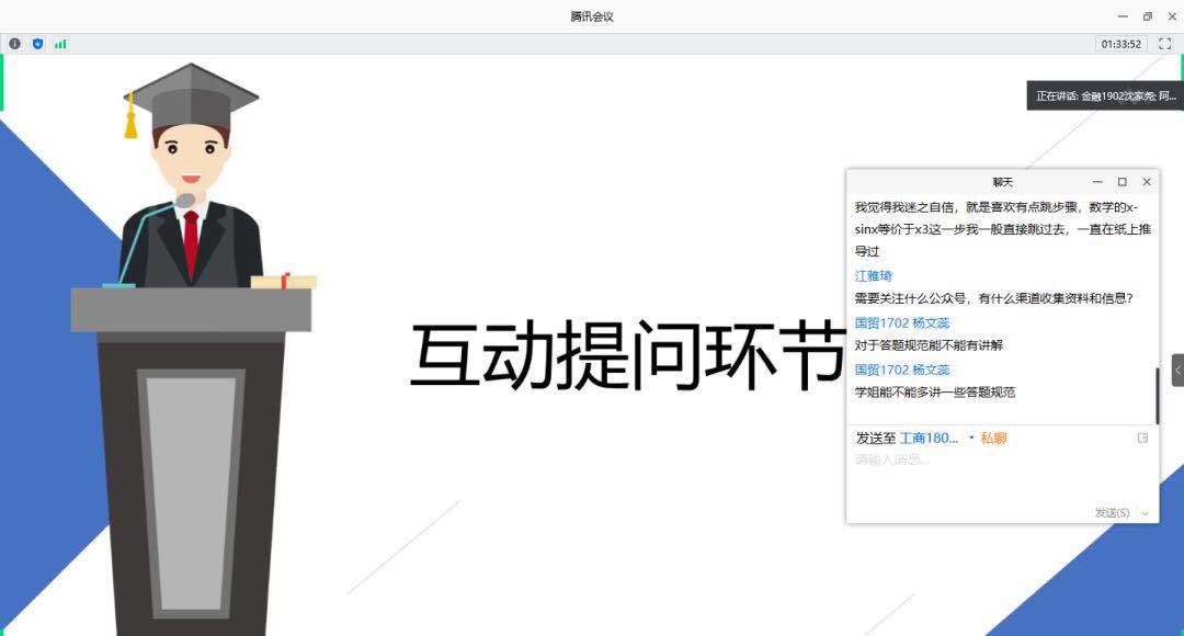 首先,陈同扬老师指出考研的同学们要明确考研动机和目标,慎重选择考研专业,并从考研利弊、政策以及专业基本情况等方面为大家进行了全面讲解。接下来,考入浙江大学的宋东杰同学向大家分享了考研各个科目的复习心得,并就考研生活中的心态问题给大家提供了宝贵的建议。成功保研公司国际经济与贸易专业的孙钟仪同学为大家介绍了保研的准备流程以及相关的注意点。考入河海大学工程管理专业的李海燕同学向大家分享了考研资料的搜集方法以及自己的备考心得。考入吉林大学法学专业的陈洪微同学和大家分享了跨专业考研的准备过程和注意点,并介绍了英语备考的要点。在分享环节结束后,四位学姐对同学们提出的疑问进行了针对性的回答,并向大家推荐了实用的考研公众号。至此,本次报告会圆满结束。