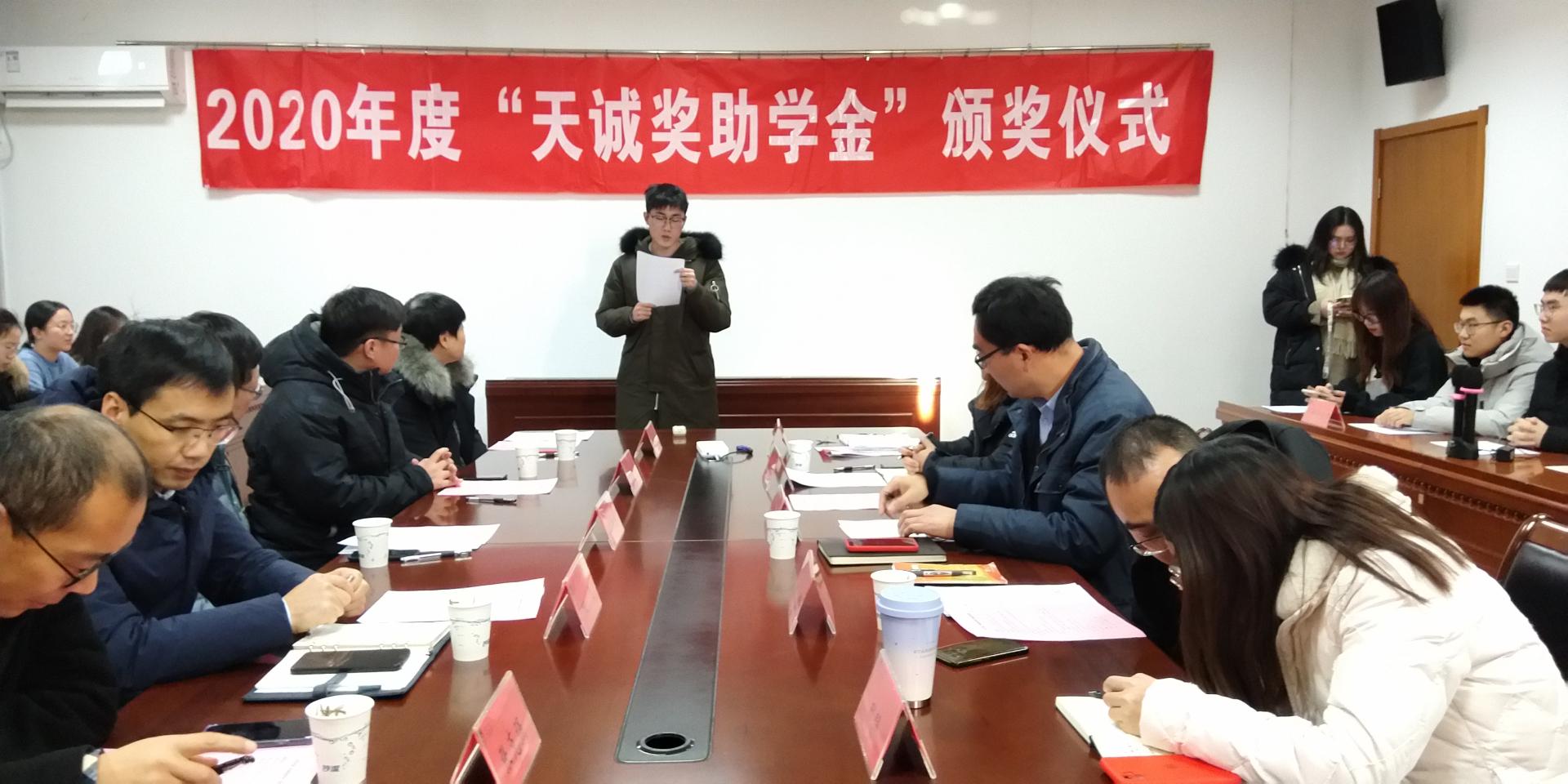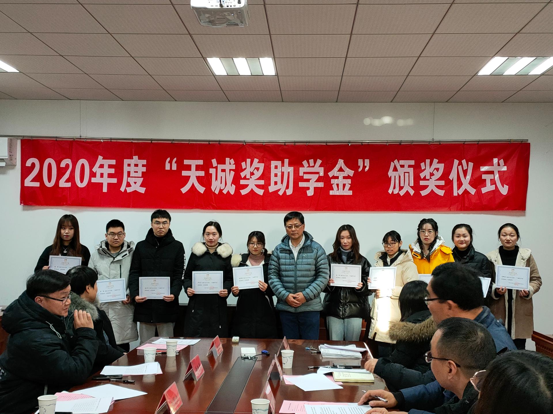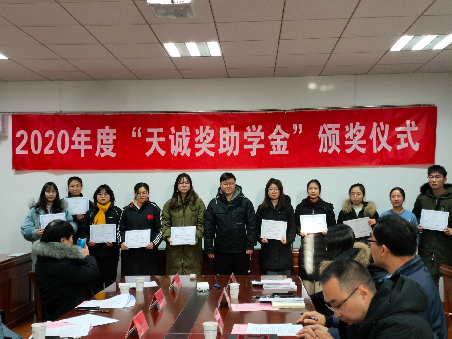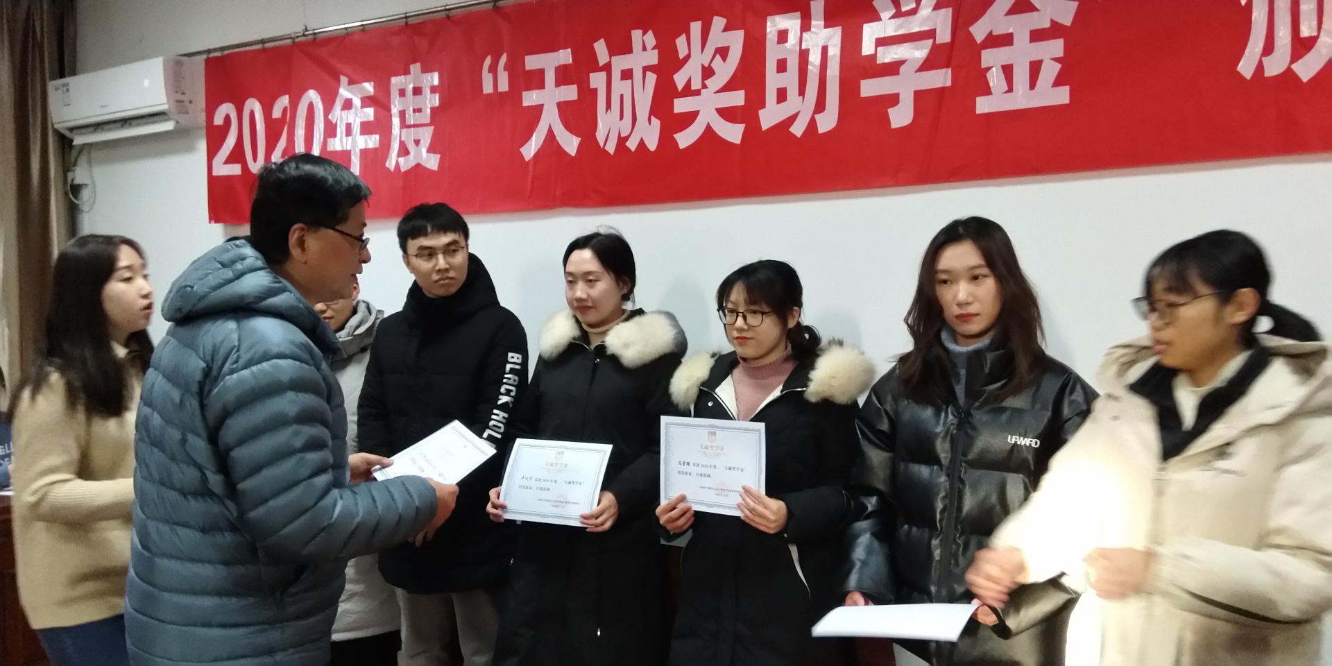 首先,岳克勤介绍出席来宾,并向德道天诚公司在太阳成集团122ccvip设立“天诚奖助学金”表示诚挚的感谢。副经理姚山季宣读了2020年度“天诚奖助学金”获奖名单。梁国庆、李传勇为获奖同学一一颁奖。