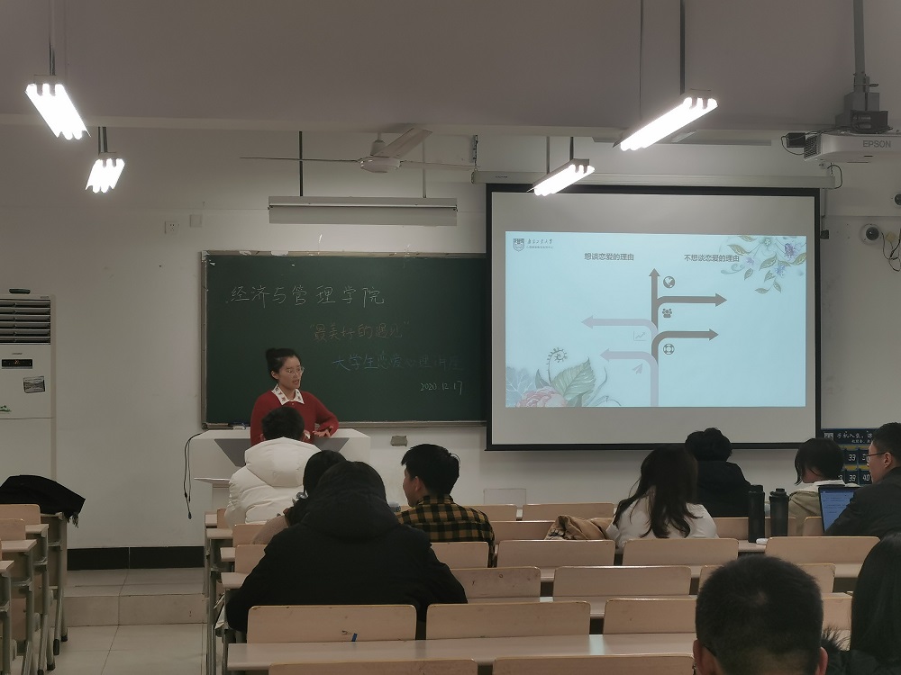 讲座聚焦恋爱中员工关心的热点问题,帮助同学们客观认识恋爱,了解爱情,更好地与他人相处,培育自尊自信、理性平和的心态。胡老师的演讲幽默生动、兼具深度与趣味性。同学们热情高涨,踊跃发言,探讨自己对于恋爱的看法,讲座在热烈的掌声中圆满结束。