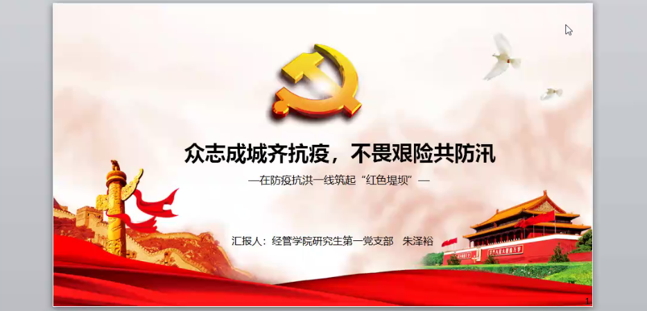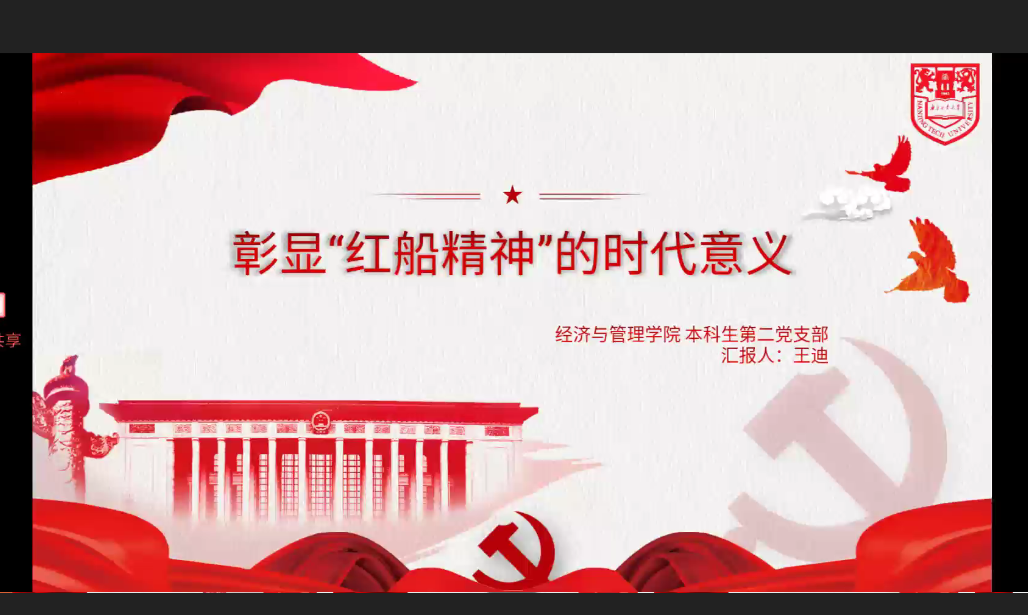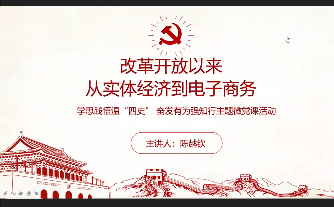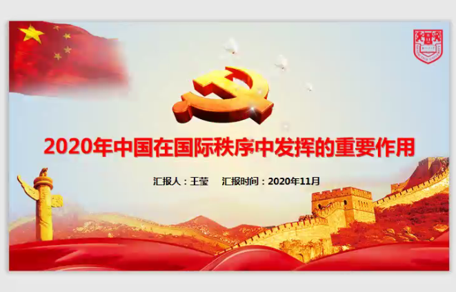 太阳成集团122ccvip研究生第一党支部朱泽裕,王莹,本科生第二党支部王迪和陈越钦四位同学,分别以“众志成城齐抗疫,不畏艰险共防汛”、“2020年中国在国际秩序中发挥的重要作用”、“彰显‘红船精神’的时代意义”和“改革开放以来从实体经济到电子商务”为主题展开演讲。首先,朱泽裕同学从抗疫和防汛两个事件分析了中国政府和人民在遇到难关时的沉着冷静与团结一致;然后,王莹同学带大家了解了当今中国在国际社会中发挥的重要作用,从中可以看出中国的国际地位和国际影响力都在不断提升;接着,王迪同学以“红船精神”为依据,向我们展示了其中蕴含的时代意义;最后,陈越钦同学将自己的专业知识与所讲内容相结合,向我们介绍了从实体经济到电子商务的历程,并对未来电子商务的发展进行了新的展望。