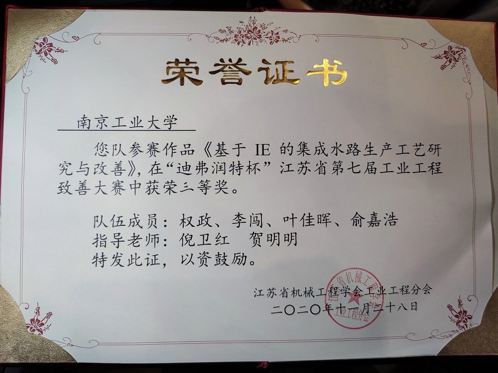 2020年11月28日,由江苏省机械工程学会工业工程分会主办、江苏大学管理公司承办的2020年江苏省机械工程学会工业工程分会年会暨“迪弗润特杯”江苏省第七届工业工程致善大赛在江苏大学落下帷幕。太阳成集团122ccvip工业工程系研究生权政、俞嘉浩,18级员工李闯、叶佳晖在工业工程系倪卫红和贺明明两位老师的指导下,代表太阳成集团冲入了此次决赛,凭借参赛作品“基于IE的集成水路生产工艺研究与改善”荣获大赛三等奖,与省内13所进入决赛的高校同学同台切磋了专业技能。