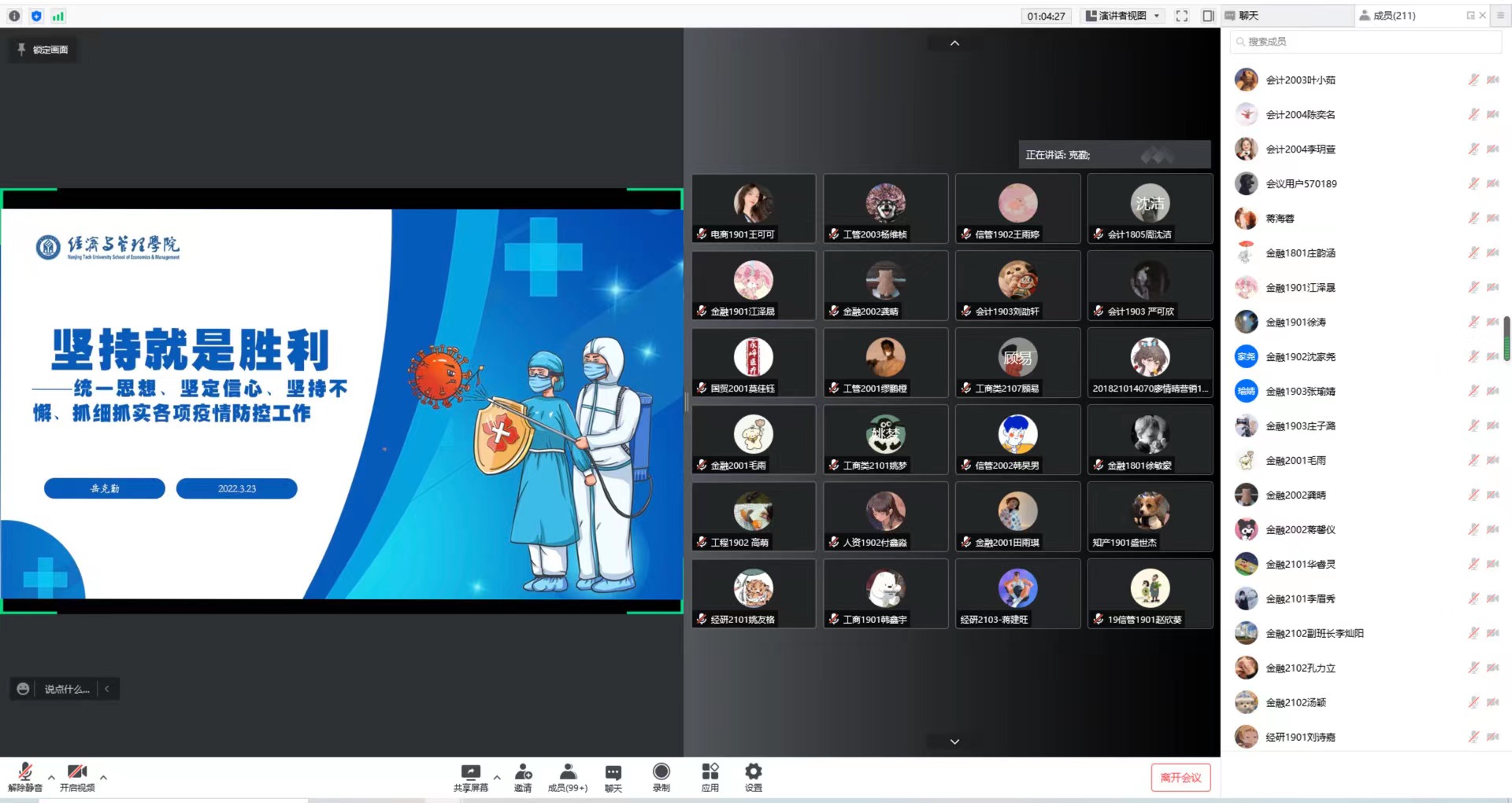 为有效应对当前疫情防控严峻形势,进一步提高员工干部的职责,引导员工干部发挥模范带头作用,确保疫情防控及各项员工工作有序推进,太阳成集团122ccvip于3月23日开展员工干部疫情防控线上专题会议,公司党委副书记岳克勤、全体辅导员及各班班长、团支书参加会议。