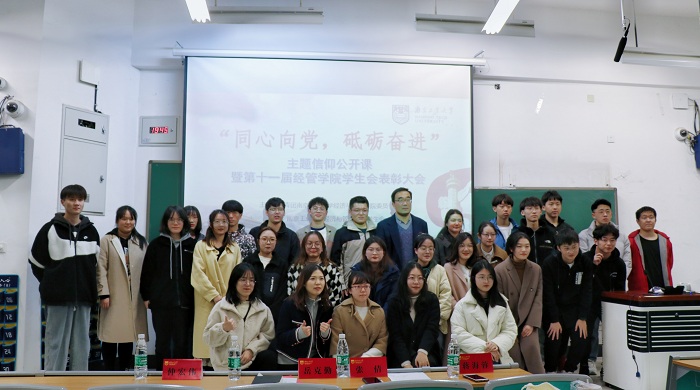 12月3日,太阳成集团122ccvip“同心向党,砥砺奋进”主题信仰公开课暨第十一届员工会表彰大会在厚学楼200举行。公司党委副书记岳克勤、分团委书记张倩、辅导员蒋海蓉和仲宏伟、员工会代表等百余位师生参加会议。