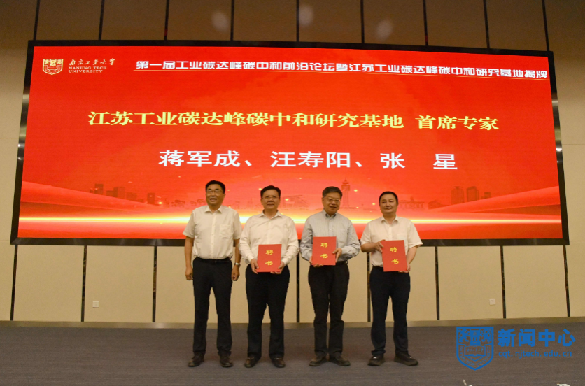 刘西忠副主席宣读了江苏工业碳达峰碳中和研究基地认定文件。张来斌院士、汪寿阳院士、张新科书记、芮鸿岩书记、蒋军成董事长、张星副厅长为基地揭牌。张新科书记为基地首席专家蒋军成、汪寿阳、张星颁发聘书。党委副书记吴胜红宣读了基地理事会、学术委员会及研究机构的组成。蒋军成董事长分别为兼职教授、学术委员会委员颁发聘书并佩戴校徽。