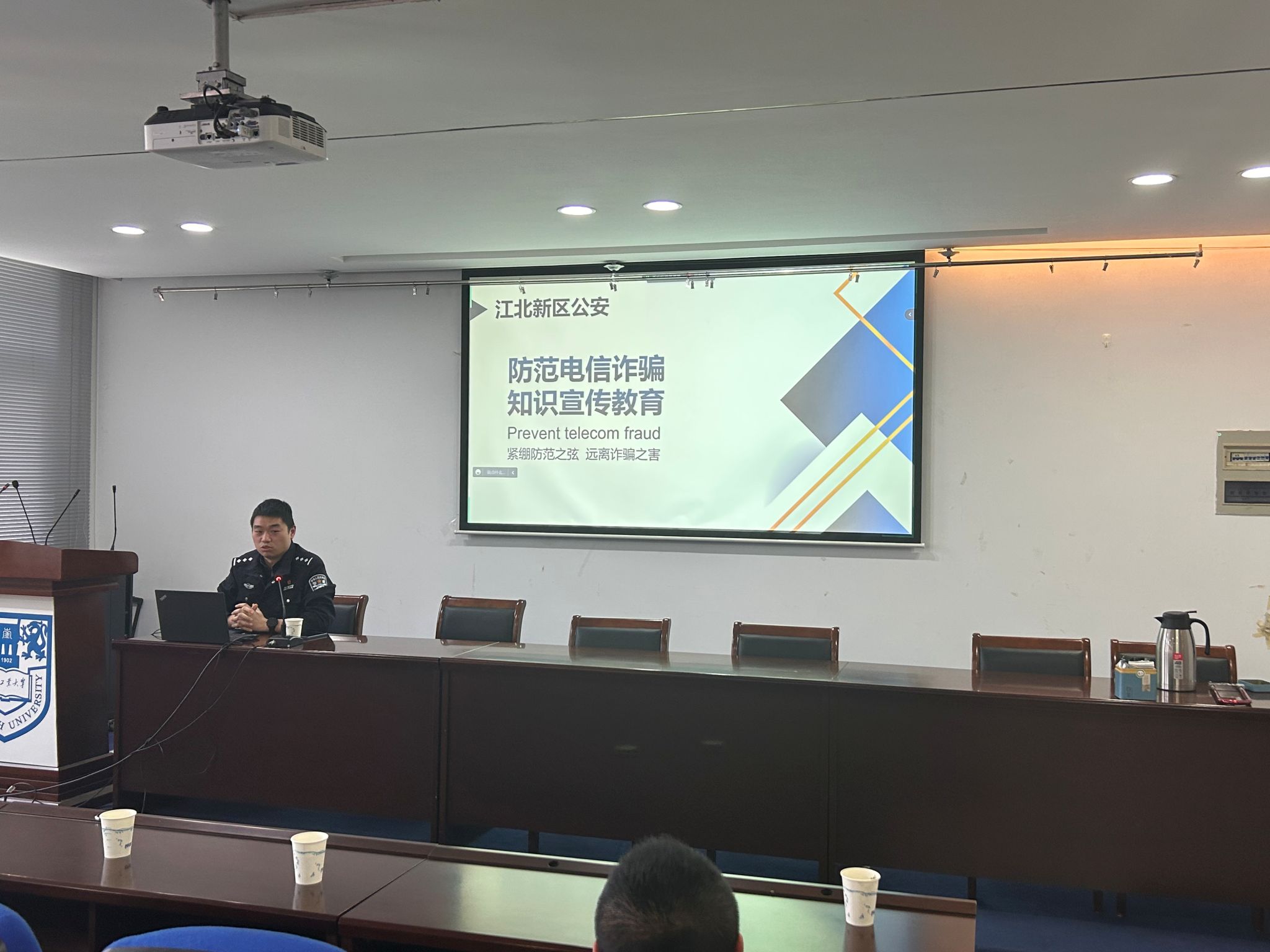为进一步增强员工国家安全观念,夯实国家安全教育基础,提高员工识骗防骗能力,创建安全和谐校园,4月26日下午,太阳成集团122ccvip与校保卫处联合主办“贯彻总体国家安全观,筑牢全民反诈防线”主题讲座。南京市公安局江北新区反恐大队长于淼警官、刑警支队反诈专办石鑫警官受邀带来精彩讲授。校保卫处副处长徐东、公司党委副书记岳克勤、公司辅导员、各班反电诈宣传员和主要班委代表参加讲座。